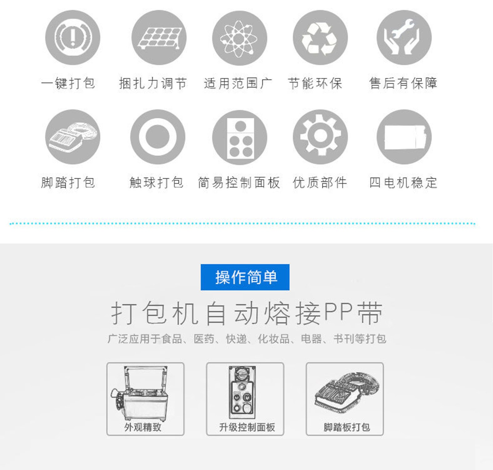 在印刷行業,用于捆扎印刷好的紙張;在建材行業,可對管材、板材進行捆扎;在農產品行業,能對成捆的蔬菜、水果進行捆扎。