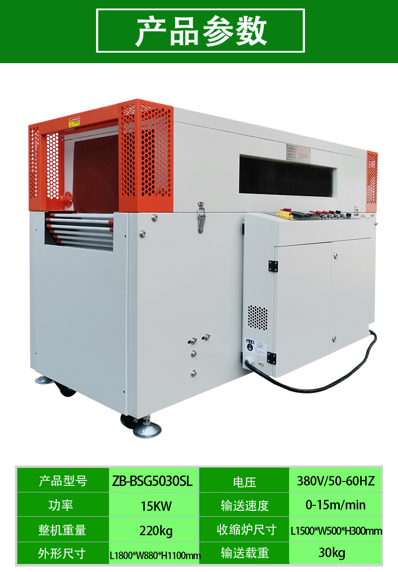 ZB-BSG5030SL熱收縮機是通過加熱裝置將熱收縮薄膜加熱至一定溫度,使其軟化并收縮,緊密地包裹在產品表面,從而實現對產品的包裝