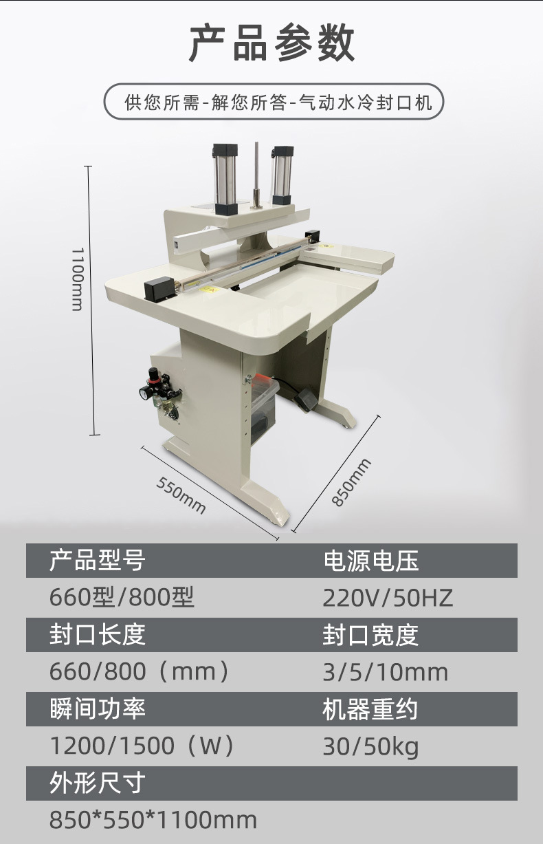 - 適用氣壓:對于氣動式水冷封口包裝機,適用氣壓是一個重要參數,通常在 0.3 兆帕至 0.8 兆帕之間。