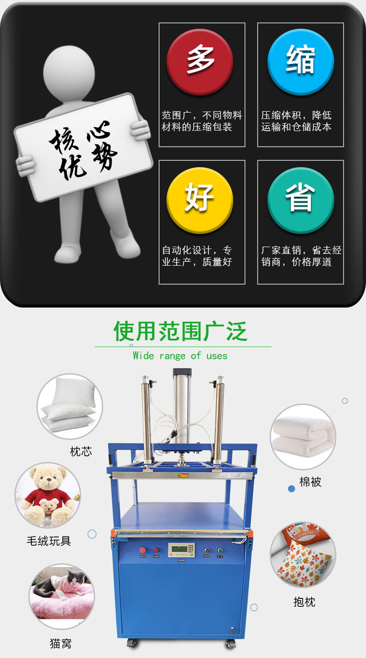 棉物料經(jīng)過真空壓縮封口包裝機后,其體積可以縮小到原來的 1/3 甚至更小,方便儲存和運輸