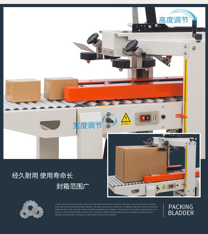 - 有膠帶支架、膠帶切割裝置和膠帶粘貼裝置等部分。膠帶支架用于放置膠帶卷,膠帶切割裝置能夠準確地將膠帶切斷,避免膠帶過長或過短影響封箱效果。膠帶粘貼裝置則通過壓力滾輪等結構將膠帶粘貼在紙箱上,并且可以調整粘貼的壓力,適應不同厚度的紙箱。