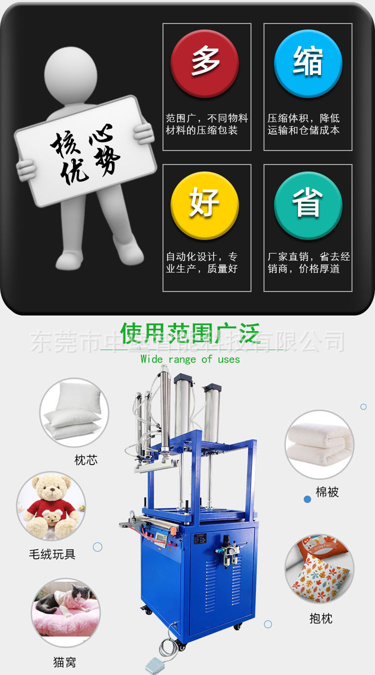 真空壓縮封口機能夠是棉物料縮小體積,真空包裝使其達到防潮防塵節省物流成本