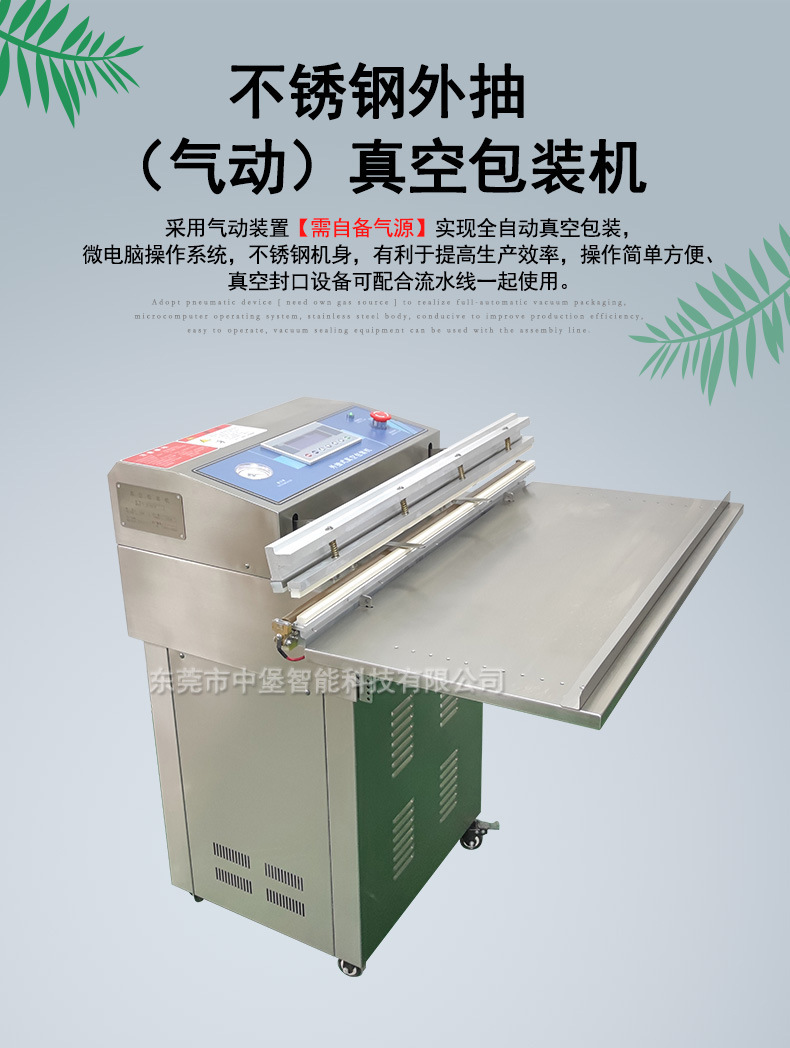- 開放式真空腔:區別于內抽式真空包裝機的封閉真空室,外抽式擁有開放式的抽氣腔,方便大型、異形物品直接放置,無需擔心尺寸受限于固定的真空室規格,能輕松應對諸如整箱水果、大型電子設備這類體積大、形狀不規則的物件。