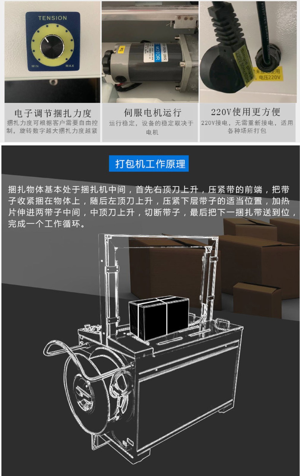 - 家電產(chǎn)品在生產(chǎn)完成后,無(wú)論是大型家電如冰箱、洗衣機(jī),還是小型家電如電水壺、電吹風(fēng)等,都需要進(jìn)行包裝和捆扎。自動(dòng)捆扎機(jī)可以根據(jù)家電產(chǎn)品的大小和重量,選擇合適的打包帶(如塑料帶或聚酯帶)對(duì)產(chǎn)品的包裝箱進(jìn)行捆扎。對(duì)于大型家電,捆扎機(jī)可以確保包裝箱在搬運(yùn)和運(yùn)輸過(guò)程中不會(huì)散開,保護(hù)產(chǎn)品不受損壞。