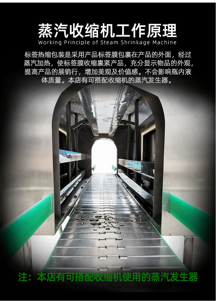 - 蒸汽收縮機:適用于對包裝溫度要求嚴格、對衛生要求較高的食品、藥品等行業,以及大桶或小瓶裝礦泉水、純凈水、汽水、茶飲料等包裝24。