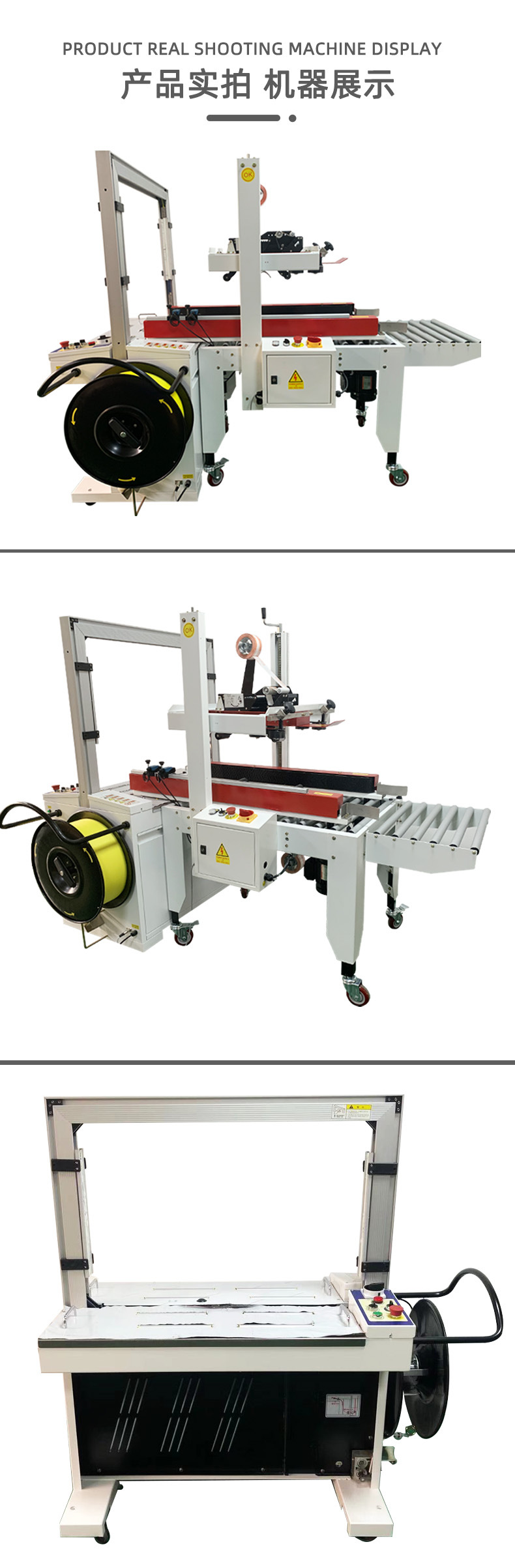 全自動封箱打包一體機,猶如一位不知疲倦且技藝精湛的包裝大師,在現代工業包裝領域展現出卓越的效能。其自動化連續作業模式,徹底革新了傳統包裝流程。設備啟動后,通過精密設計的輸送帶,平穩且快速地將待包裝紙箱源源不斷地輸送至封箱工位。在封箱環節,智能機械臂或高效皮帶裝置精準無誤地將紙箱上蓋與下蓋迅速折合,動作一氣呵成,緊接著膠帶粘貼裝置以極高的速度和精度,將膠帶整齊牢固地貼合在紙箱接縫處,完成完美封箱。封箱后的紙箱無縫銜接,即刻被輸送至打包工位。此時,打包機的穿帶機構如同靈動的舞者,敏捷地將打包帶準確無誤地穿過紙箱預設的打包位置,隨后拉緊機構瞬間發力,將打包帶緊緊束縛在紙箱上,最后通過熱熔或咬合機構,實現打包帶的穩固連接,整個過程流暢自然。