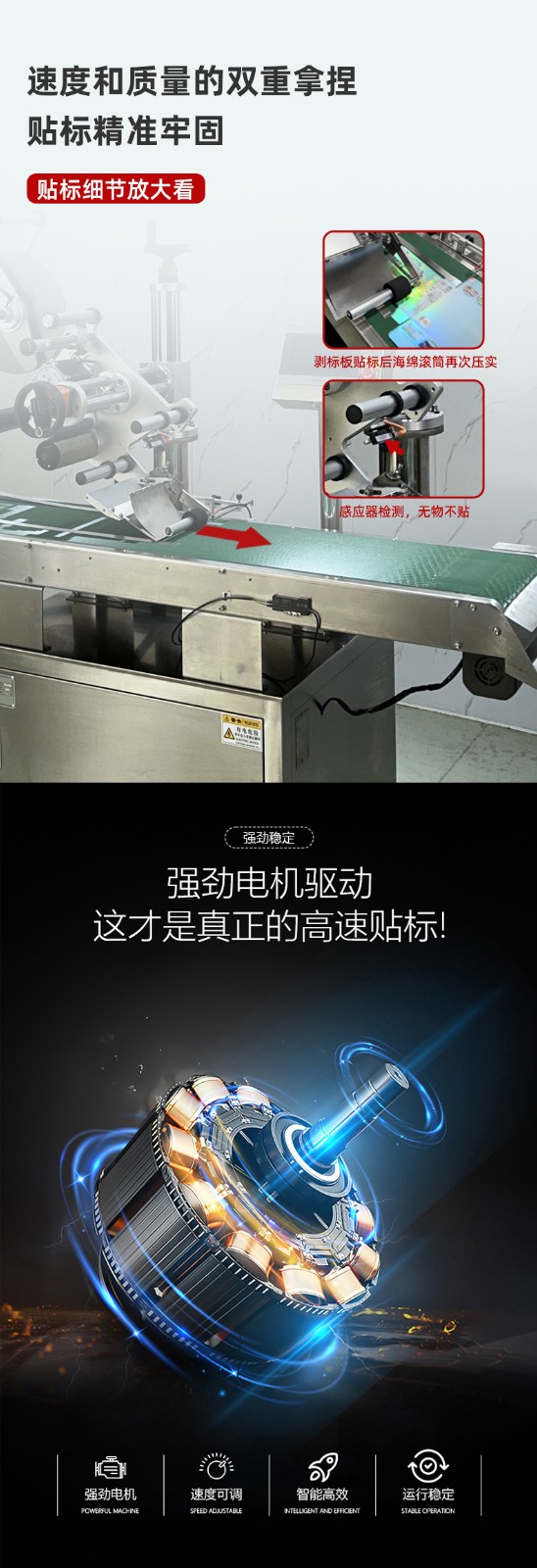 - 調(diào)整電機(jī)轉(zhuǎn)速:全自動(dòng)分頁(yè)貼標(biāo)機(jī)一般采用電機(jī)驅(qū)動(dòng)標(biāo)簽輸送和產(chǎn)品輸送。在控制系統(tǒng)中,找到電機(jī)轉(zhuǎn)速調(diào)節(jié)參數(shù),通過(guò)增加或減少電機(jī)的轉(zhuǎn)速來(lái)改變貼標(biāo)速度。例如,將電機(jī)轉(zhuǎn)速?gòu)?500 轉(zhuǎn) / 分鐘調(diào)整到 800 轉(zhuǎn) / 分鐘,貼標(biāo)速度會(huì)相應(yīng)提高。不同品牌和型號(hào)的貼標(biāo)機(jī),其電機(jī)轉(zhuǎn)速調(diào)節(jié)方式可能不同,有的是通過(guò)觸摸屏直接輸入數(shù)值,有的則是通過(guò)參數(shù)菜單進(jìn)行選擇調(diào)整。