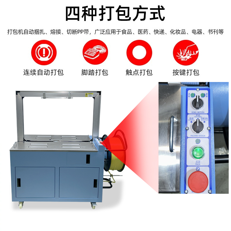 - 自動上帶:機器啟動后,會自動從打包帶卷中抽出打包帶,并將其傳送到預定的位置,準備進行打包。這個過程無需人工干預,大大提高了工作效率。